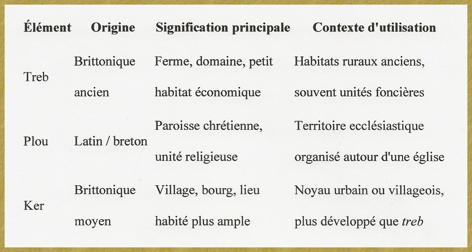 Les éléments treb , plu et ker sont trois composantes toponymiques majeures en Bretagne, d'origines et de significations distinctes qui tirent différentes dimensions de l'occupation et de l'organisation du territoire.